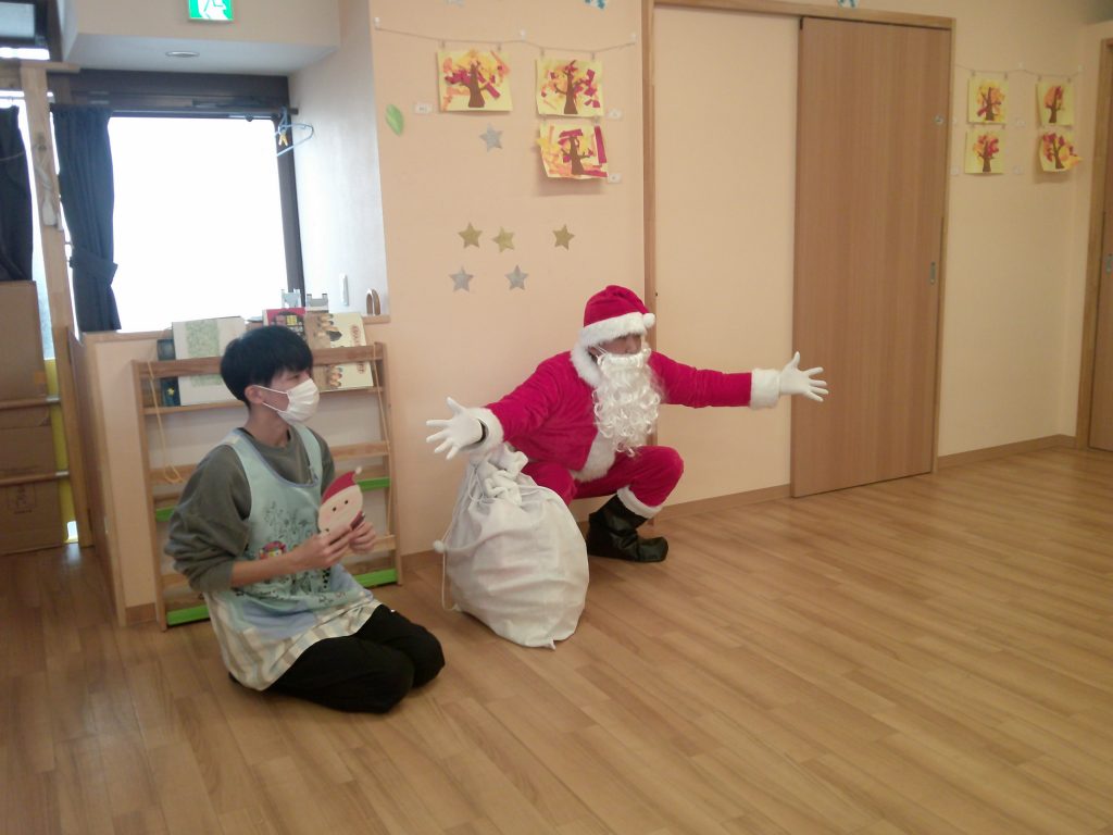 朝からクリスマス会を楽しみにしている様子の子どもたち・・・クリスマスツリーの最後のオーナメントをみんなで制作し、かわいい帽子をかぶりクリスマス会を行いました。クリスマス会では、「サンタさんくるかな・・・」とドキドキしながらも、“クリスマスのうたが聞こえてくるよ”を踊ったり、“あわてんぼうのサンタクロース”の曲に合わせてうさぎ組はタンバリン、りす組は鈴、ひよこ組はマラカスで音を合わせて楽しみました。どこからか「メリークリスマス!」の声が聞こえると、シーンとした後、サンタさんが登場しました。静かにびっくりする子や笑顔になる子、泣き出す子と様々な姿が見られました。サンタさんからのプレゼントは笑顔でもらいに行く子も多く、プレゼントに「ありがとう」と言える姿に子どもたちの成長を感じました。