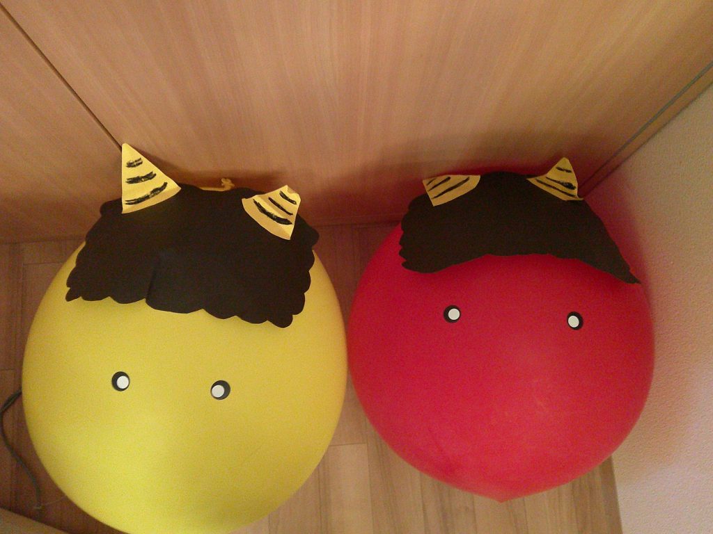 朝から「オニくる?」とちょっとドキドキしながら節分の話(由来)など聞き、鬼がかわいい風船の鬼だとわかると元気いっぱい“キャー”と楽しそうな声をあげ、ボールを手にとり風船鬼をめがけて投げる子どもたち。ひよこ組さんとりす組さんは、ボールを片手もしくは両手に持ちボールを投げていましたが、うさぎ組さんは両手に持てるだけのボールを手に持ち“おにはそと!!”と楽しんでいました。2歳児クラスの自分で考え効率良く(?)ボールを投げることを考えていることに1年の成長を感じました。